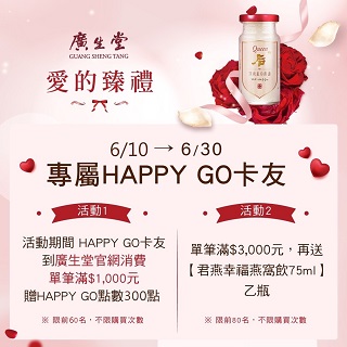 ※完成訂單贈點名額有限贈完為止,將不另行通知。點數回饋資格以廣生堂系統追蹤紀錄為準,因不可歸責於HAPPY GO或廣生堂之事由,致追蹤資料有失敗、延遲、遺失、錯誤、無法辨識或其他人為或非人為因素, 以致未能完成追蹤之情況,將不予計算點數回饋資格。